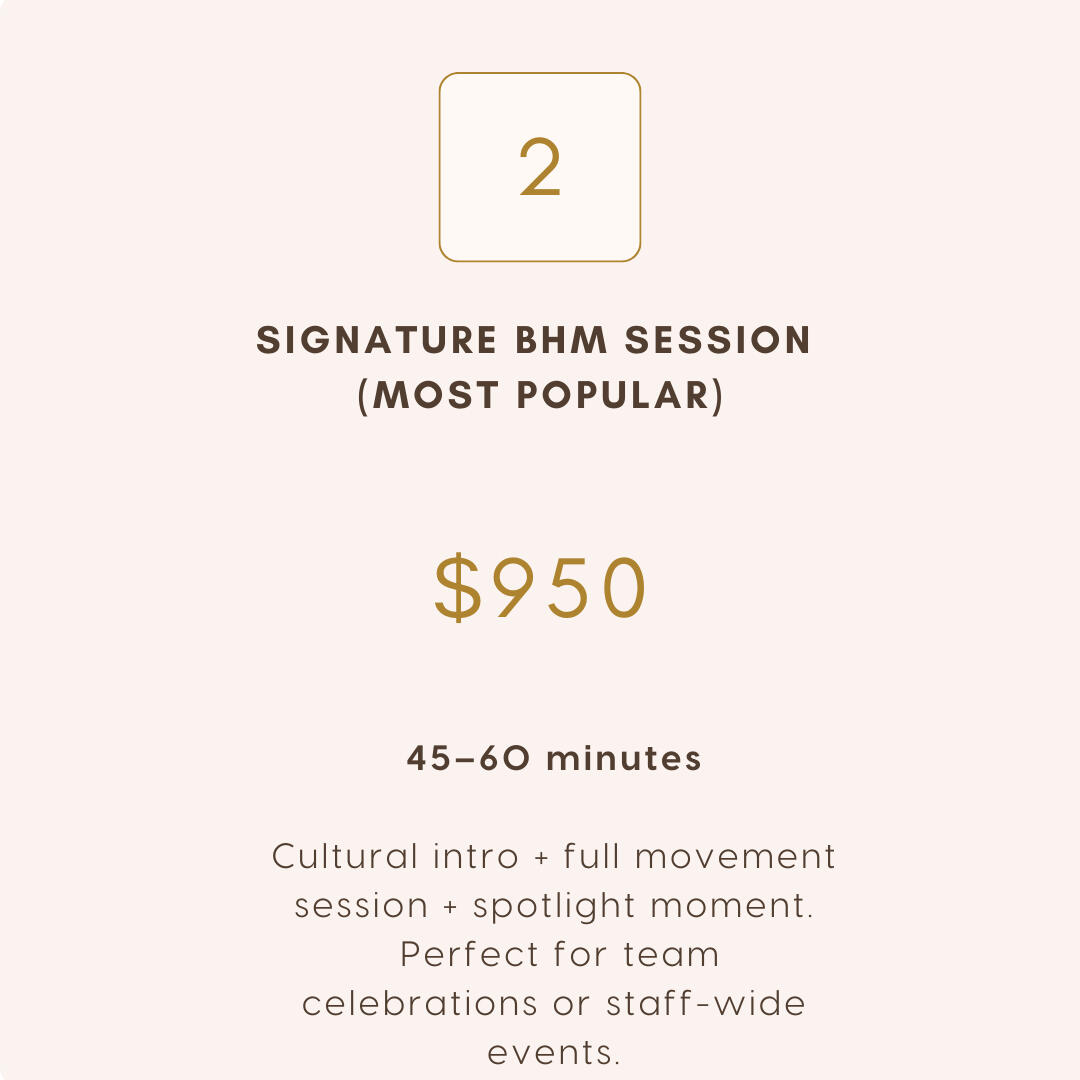 Bring your workplace a meaningful, uplifting Black History Month program rooted in culture, movement, and community connection.Availability is limited, and sessions are confirmed on a first-come basis.